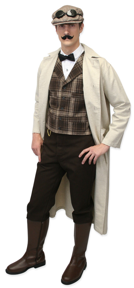 Barnaby Clifton (above) is an intrepid driver who's infamous for owning the first horseless carriage in the district. His costume comprises a linen duster, a plaid vest, mid-calf boots, a cap, brass googles and to top it off, a debonair stage mustache.